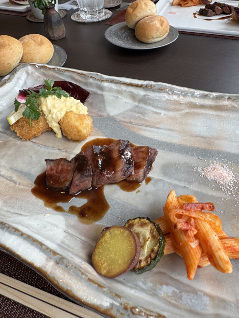 黒毛和牛の赤ワインソースと魚と帆立のフライ